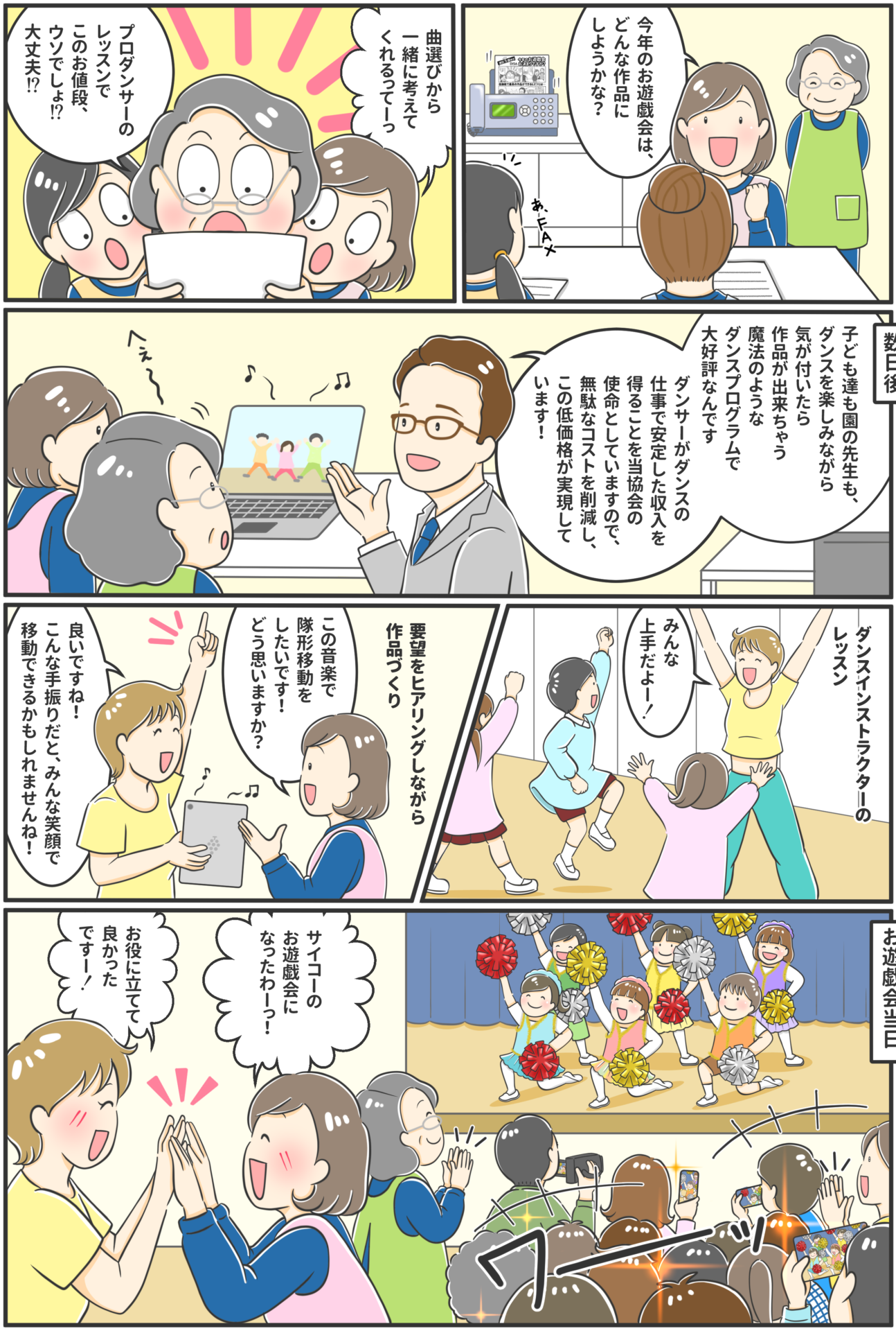 外部の研修に参加したり作品づくりに思い悩む時間をなくし、保育活動に専念していただけます!担当インストラクターが貴園のご意向をヒアリングしながら選曲から作品づくりまで対応致します。